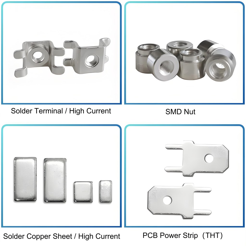 In addition to current-carrying copper blocks, welded terminals, PCB insert clips, and surface mount nuts are widely used in industries such as power, electrical, electronics, and automotive. Here are some product highlights: